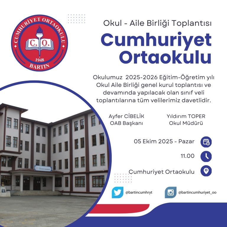 Okulumuz 2025-2026 Eğitim-Öğretim yılı Okul Aile Birliği genel kurul toplantısı ve devamında yapılacak olan sınıf veli toplantılarına tüm velilerimiz davetlidir.
